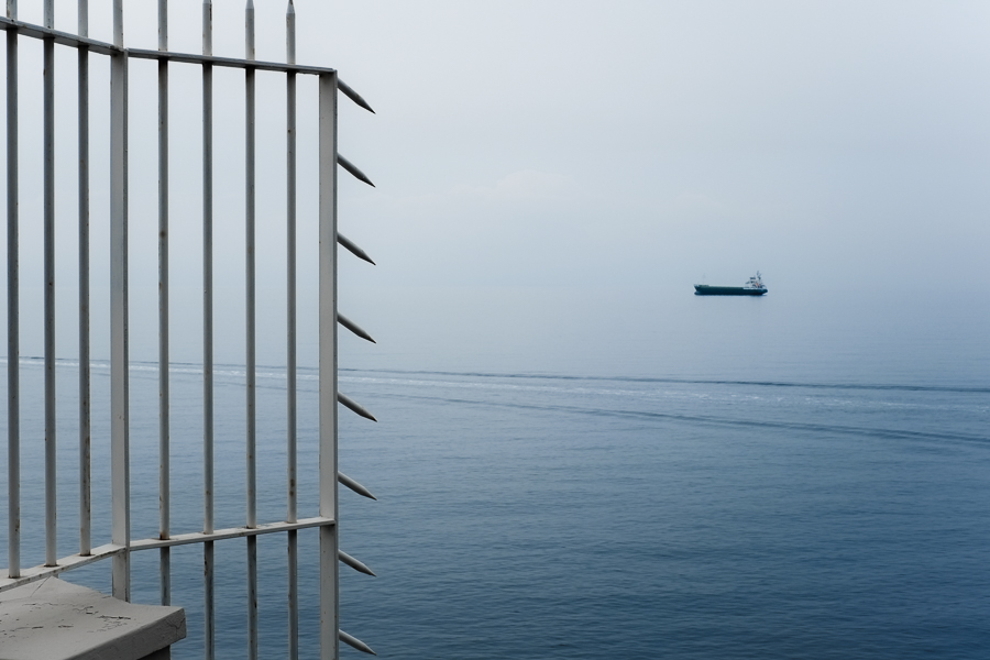 | Molto bella. Mi piace il contrasto tra l'etereo/immateriale del mare/cielo e il reale/materico dell'inferriata, contrasto accentuato dalle punte accuminate rivolte verso il mare.