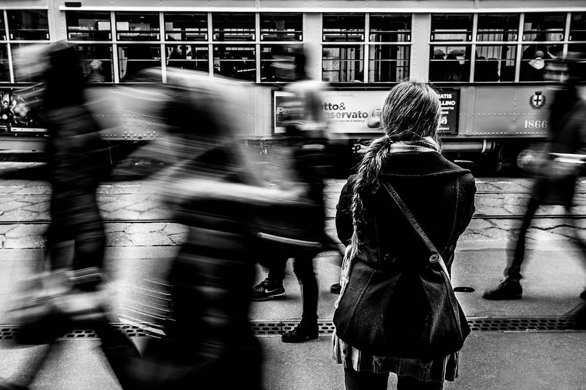 Effettivamente la foto non è proprio spontanea. Avevo visto qualcosa di simile in giro e ho voluto creare un effetto simile. La ragazza ferma era complice... in attesa di un tram (di fronte alla fermata) e di un po' di passanti
