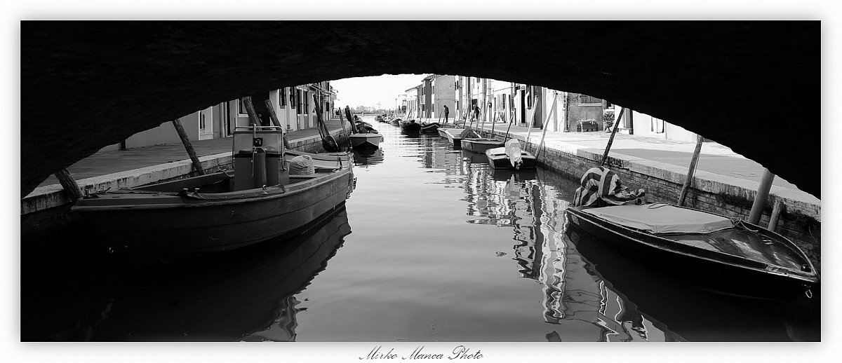 Bello questo scorcio, incorniciato dall'arco del ponte. Molto bello il BN, ricco di sfumature.