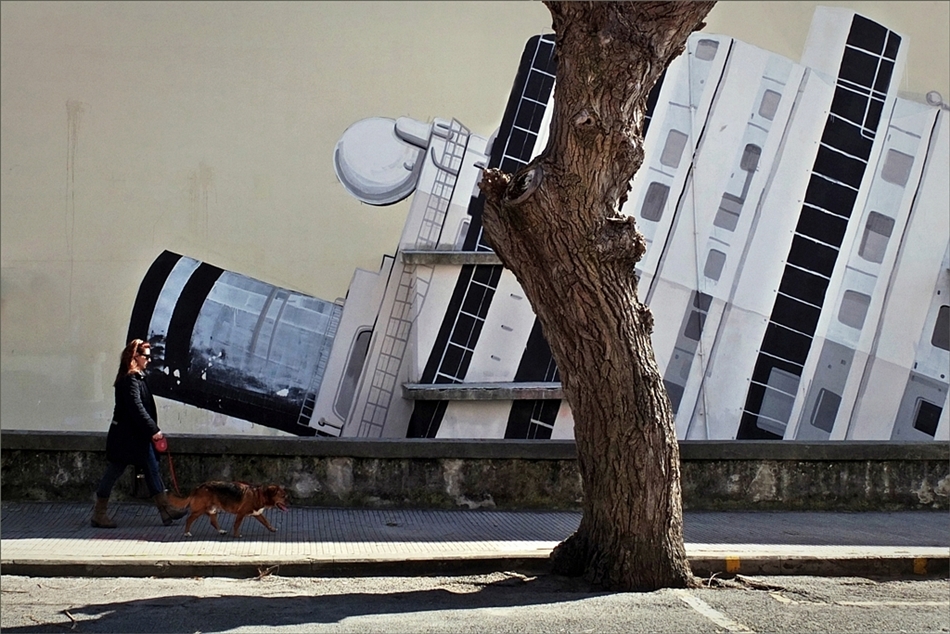 C'è una location insolita ed interessante, ma non ritrovo un legame tra il murale e la passante: restano due unità a sé stanti, che non si compensano a vicenda. Inoltre il punto nel quale hai ripreso la donna, non mi sembra il più ottimale, in quanto in corrispondenza del bordo del fumaiolo disegnato. La sovrapposizione crea una zona "pesante" all'occhio, che si poteva diluire attendendo che il soggetto si spostasse più avanti.