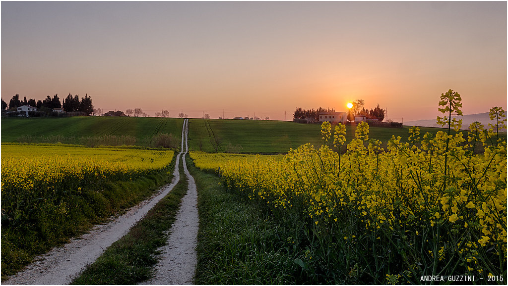 Ciao Andrea, Lo stradone sembra portarci dritto dritto attraverso tutto il frame; trovo molto ben collocati i fiori di colza a destra che sembrano accarezzare e salutare il sole luci e colori giusti.