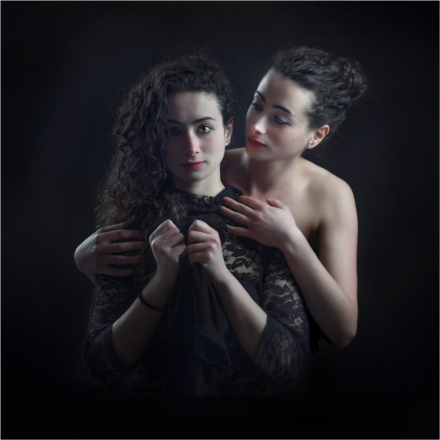 La figura sdoppiata, angelo protettore di se stessa, espressione anche e sopratutto di un possible altro se che si affianca all'Io, nudo e privo di sovrastrutture, più libero e leggero. Anche a me piace questa proposta, questo approccio visivo al ritratto quasi psicanalitico; tecnicamente avrei preferito un nero assoluto intorno alla duplice protagonista...