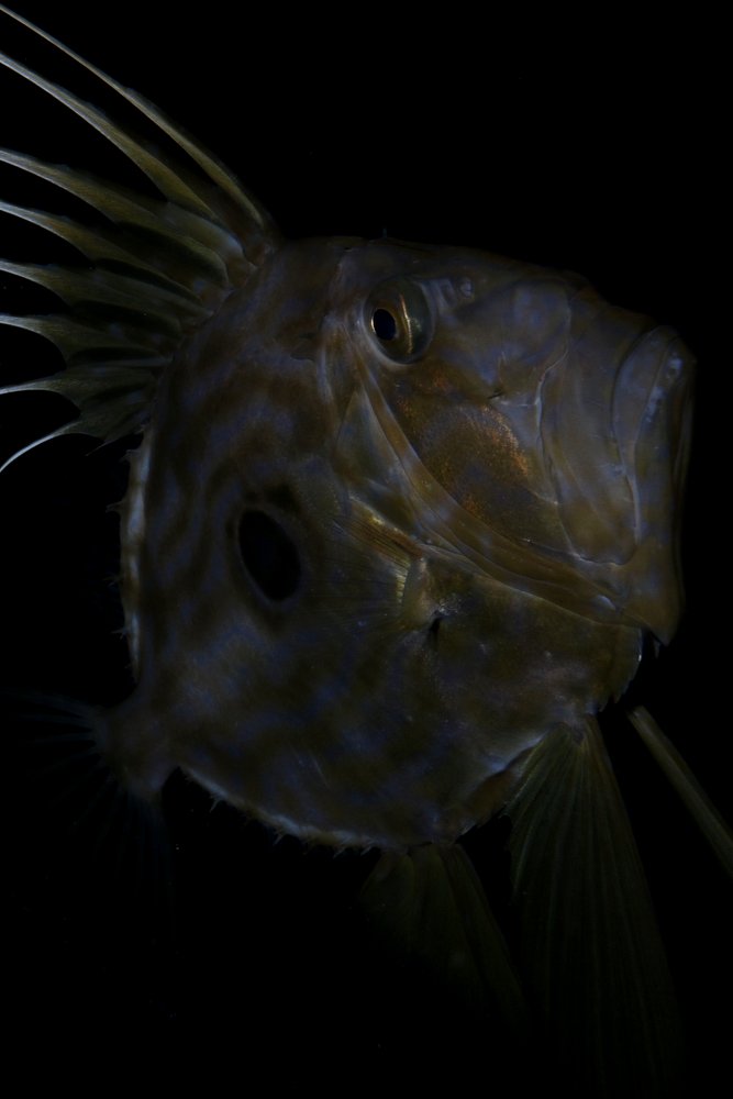 MF Canon 70D, obiettivo 17-40mm f4.0, custodia easydive leo III, Flash Ikelite; no, non è dietro un vetro, siamo in immersione notturna nella splendida baia di Porto Badisco, vicino Otranto, a 18m. Questo bellissimo pesce Pallonaro ci ha svernato, ed era diventato un incontro fisso nei primi mesi di quest'anno.