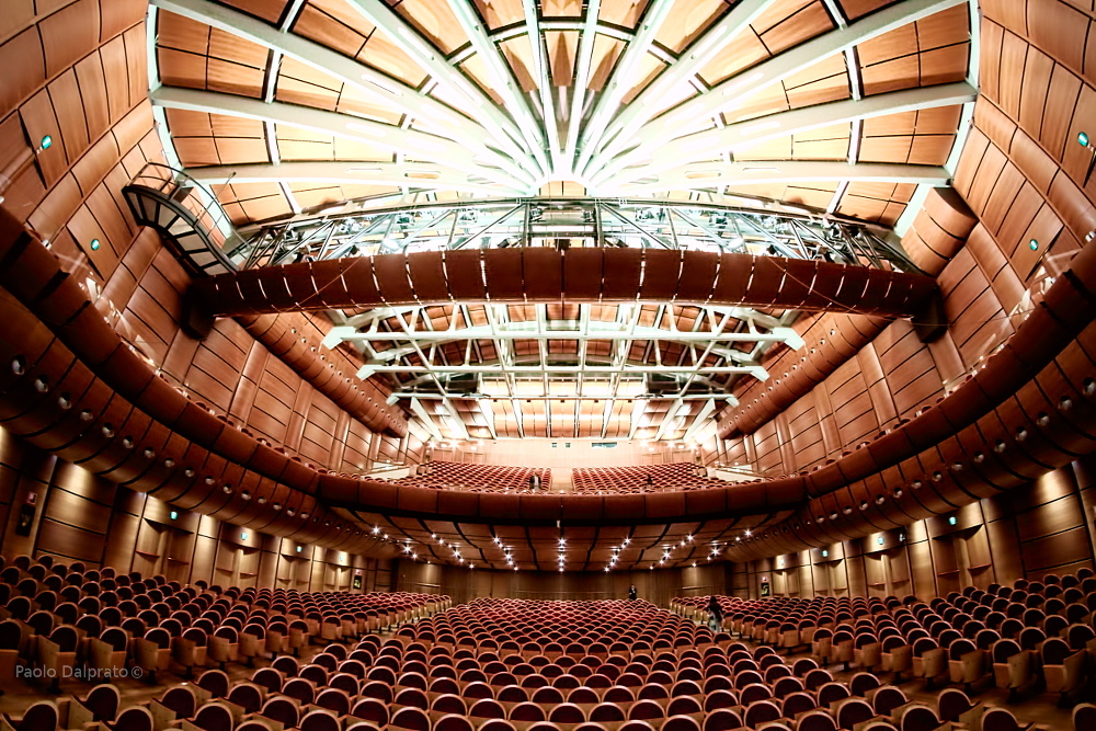 Mi fa piacere che tui abbai detto del legno, perchè in quella struttura è importante, sono pannelli di pero, sostenuti da un a struttura e non attaccati alle pareti, tutto questo per migliorare le proprietà acustiche. La struttura in alto, quella a raggi, ha una sua piccola storia. Prima di essere l'Auditorium di Milano era un cinema, ed il soffitto era controsoffittato. Quando hanno cominciato a fare i lavori hanno liberato il soffitto trovando quella struttura, rapido cambio di progetto per lasciarla in vista e secondo me hanno fatto benissimo.