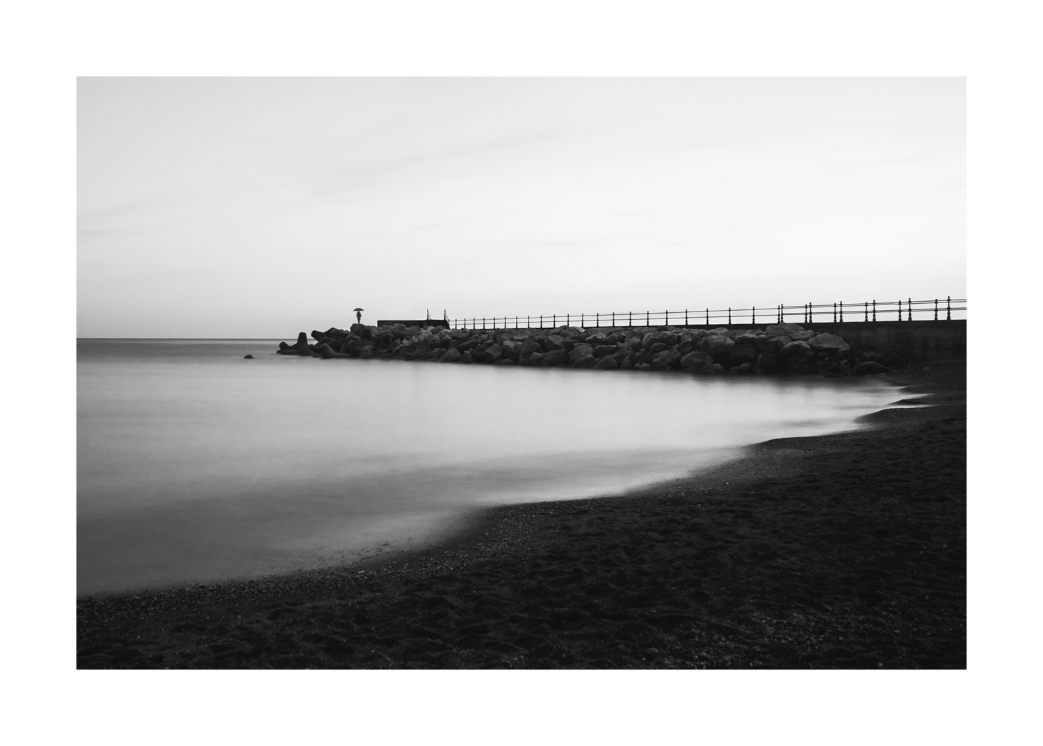 Una foto che mi piace moltissimo, che condensa in una confezione discreta, come deliziosamente in sottotono, una tematica paesaggistica di rara quiete accanto ad un miniracconto concentrato sulla minuscola figura umana. Il microscopico omino con ombrello, appena percepibile in silhouette alla fine del pontile, è un realtà un gigante fotografico entro questa scena. Proviamo a toglierlo e tutto si fa vago, come vuoto, forse già troppe volte visto. Ma questa esile forma simboleggia una percorso, un grumo di pensieri che trovano il loro spazio nel silenzio, una raccoglimento umano che trova nella scena la sua culla ideale.