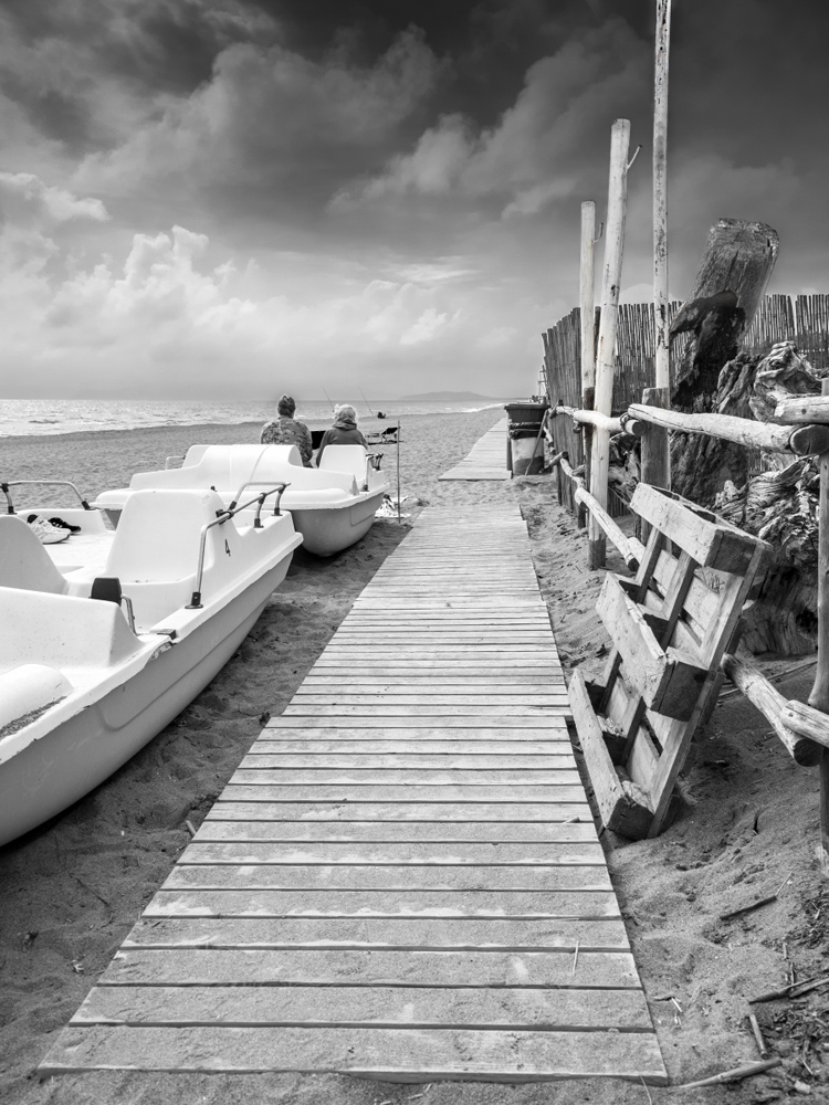Mi piace Daniele, bella composizione. La passerella guida naturalmente lo sguardo verso l'imminente tempesta e le due persone sul pedalò sembrano attenderla preparate.  _________________ - Fotografo della domenica |