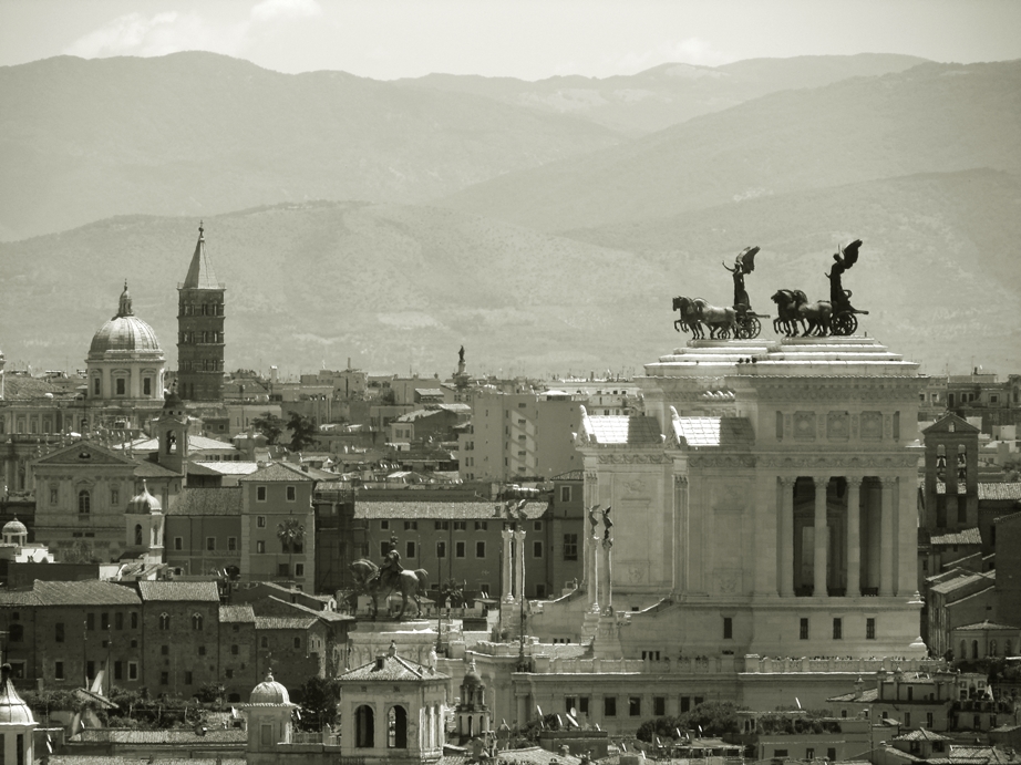Ho cercato di ottenere, in una singola foto, la compresenza di un monumento sufficientemente dettagliato, di una classica panoramica sui tetti della capitale, e di uno sfondo montuoso/collinare in cui fosse visibile una parte di cielo.