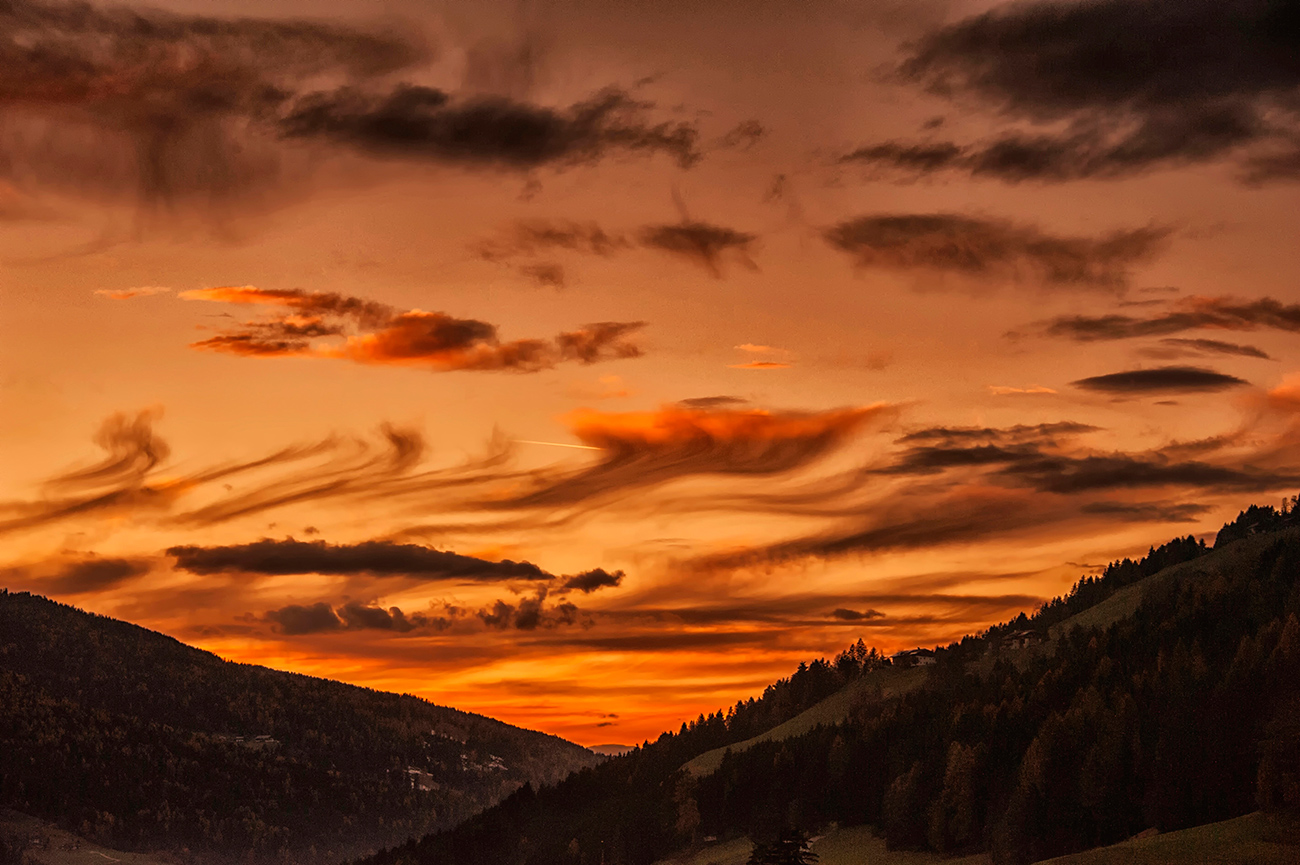 Un bel tramonto di quelli tosti infuocati; le nuvole sembrano disegnate con un pennello.
