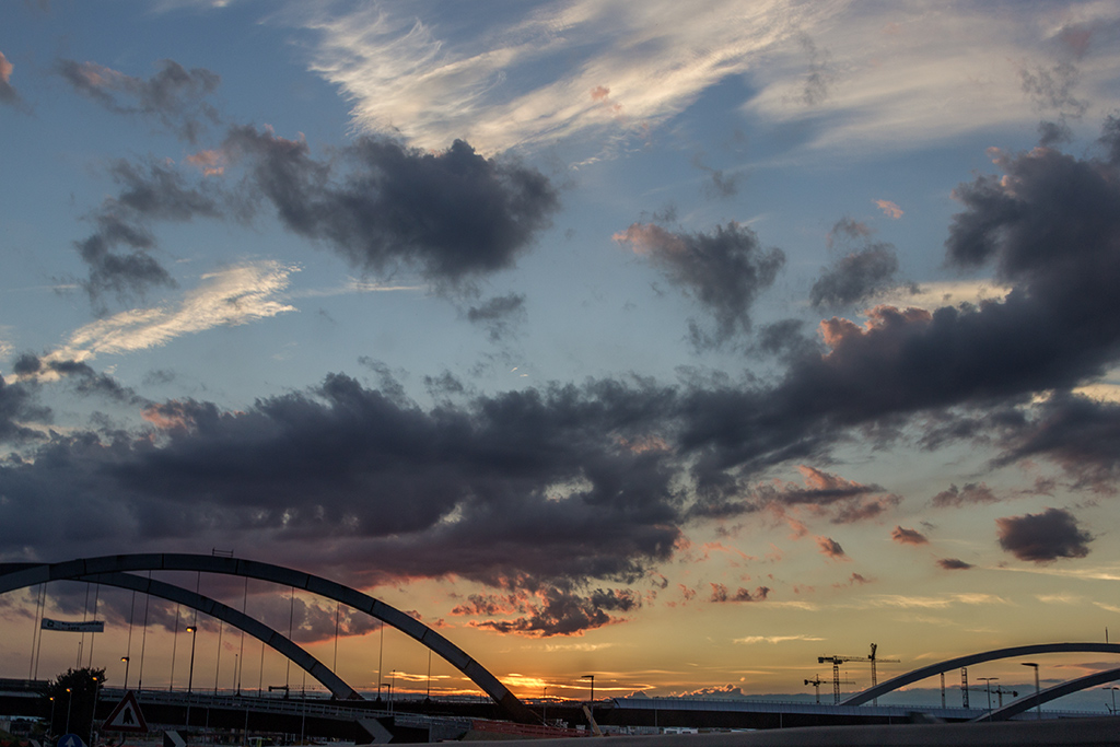 Effettivamente con le correzioni di Renzo è già tutta un'altra cosa: la sensazione ora è di ordine e compostezza. Il cielo meritava moltissimo e le strutture del ponte erano una bella opportunità. Nei toni mi ricorda molto i cromatisimi che circondavano anche in questa mia foto delle strutture tubulari ricurve.