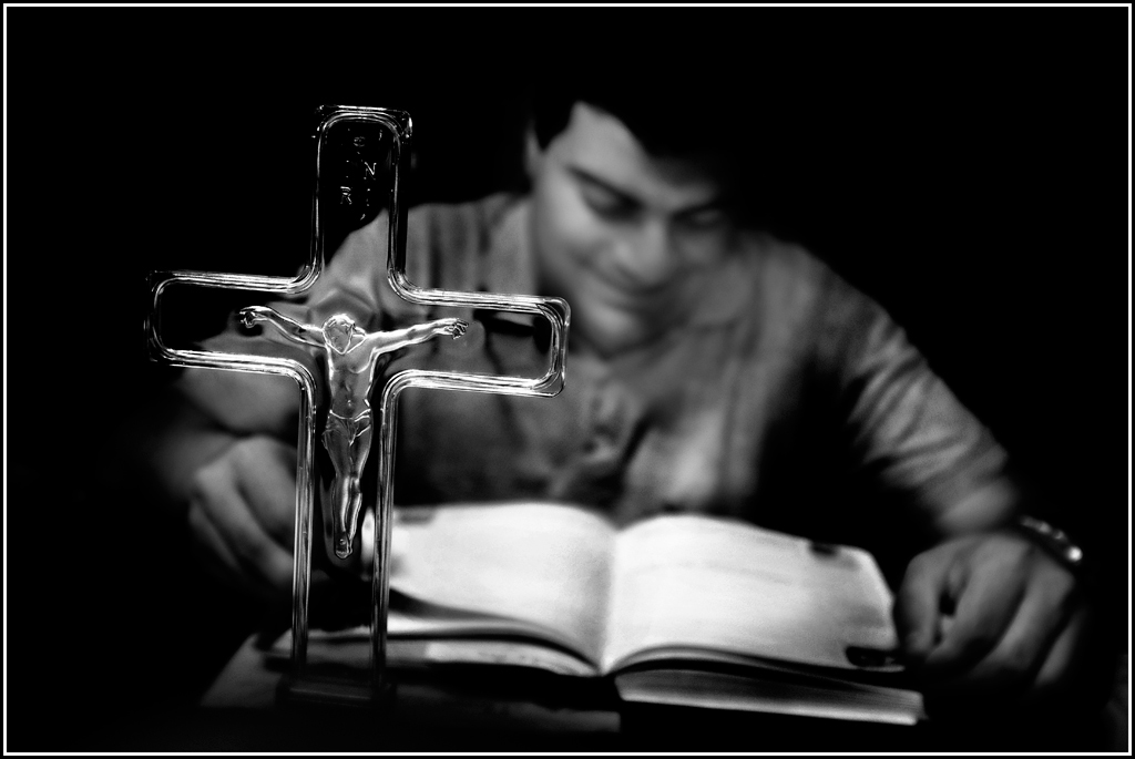 Bellissima la resa del crocefisso di vetro o di plexiglass, perfetta, ho qualche perplessità sul sorriso (passami il termine alla "Joker" di Batman) del lettore di sacra scrittura, stona un po, a mio avviso...