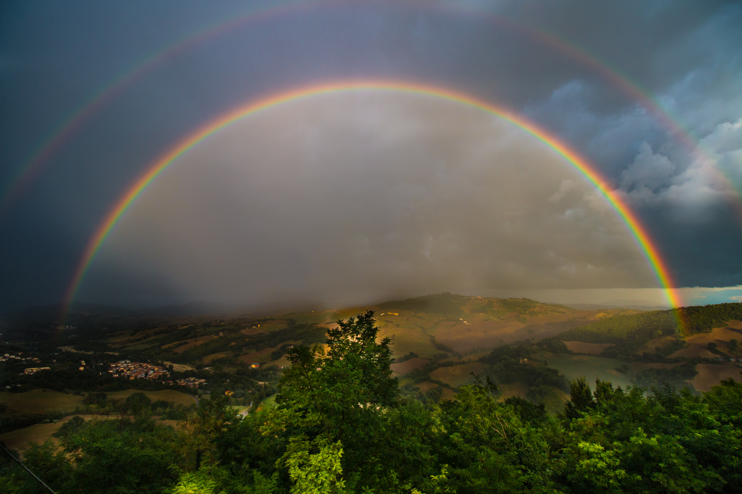 Ti presenti con una visione paesaggistica di un fenomeno frequente ma non così facile da fotografare come si crede. Spesso si mostra in contesti che hanno forti contrasti e differente grado di luminosità in una unica inquadratura. E l'esposizione può essere critica. Qui poi addirittura doppio rainbow!
