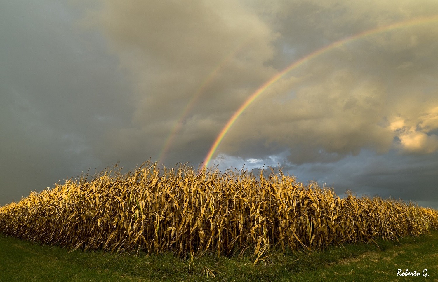 | Il granoturco sembra inchinarsi al cospetto dell'arcobaleno doppio. In cielo è presente del rumore e secondo me la luce mom è gestita al massimo; si poteva anche fare di meglio. |
