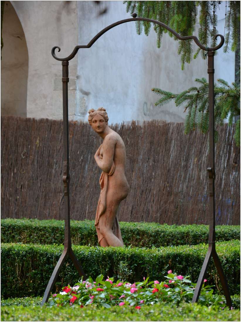 I fiori sotto non ci stanno proprio. Per il resto direi che, consapevolmente o no, hai colto nel segno, al punto che, ad una prima occhiata, sarà anche per quel "rosa carne", la figura pare umana e sorpresa. Del resto è così la statua, è così che lo scultore la fatta. Ma tu hai aggiunto un di più che è quella cornice in metallo che è il surrogato di una porta socchiusa, di una finestra e quindi sottende qualcuno che guarda di nascosto. Il fatto che la composizione sia apparentemente incerta (e magari tu la cercavi migliore e avresti perso il risultato trovandola) sottolinea la fugacità del "momento". In sostanza, "hai fatto la foto", non hai scattato la foto ad una statua.