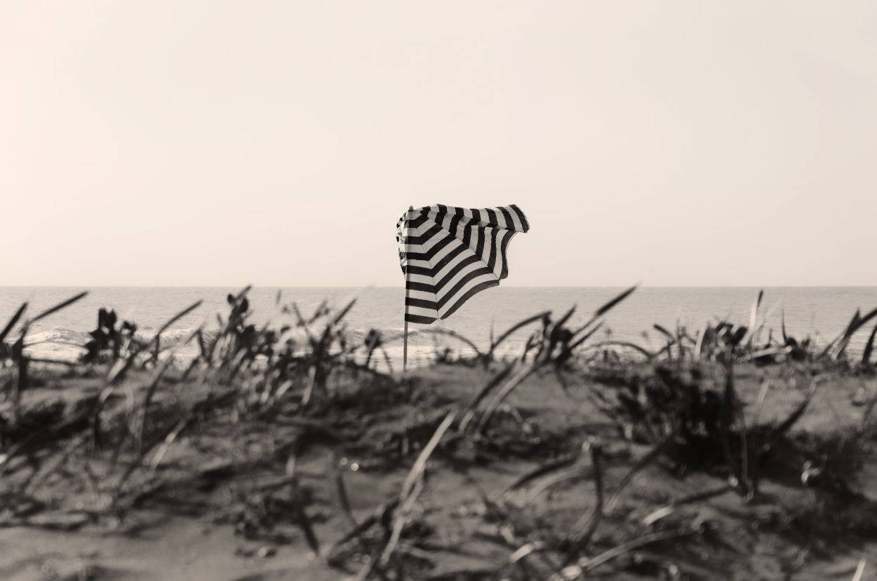 delle varie versioni preferisco l'originale, bello il contrasto tra lo sfocato di primo piano e la nitidezza dell'ombrellone; solo due cose da rivedere: un decentramento dell'ombrellone sulla sx vista la direzione del vento verso dx e la presenza di artefatti nel cielo dovuti molto probabilmente alla post produzione Ciao