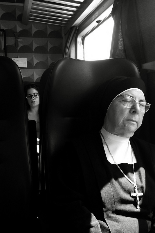 Riguardo il taglio in basso, mi rendo conto che possa presentarsi non molto gradevole: avevo la possibilità di riprendere le mani, ma ho preferito la diagonale che divide la foto in una zona con la luce che entrava dal finestrino, e quella più in ombra, con i posti a sedere propri di fronte alla mia postazione...
