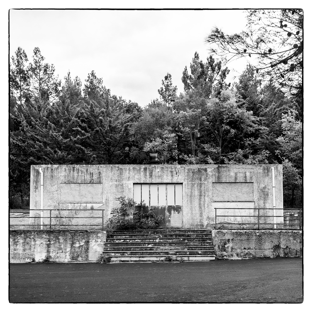 buona la composizione e la differenziazione dei piani (strada, struttura, alberi, cielo), buono il B/N