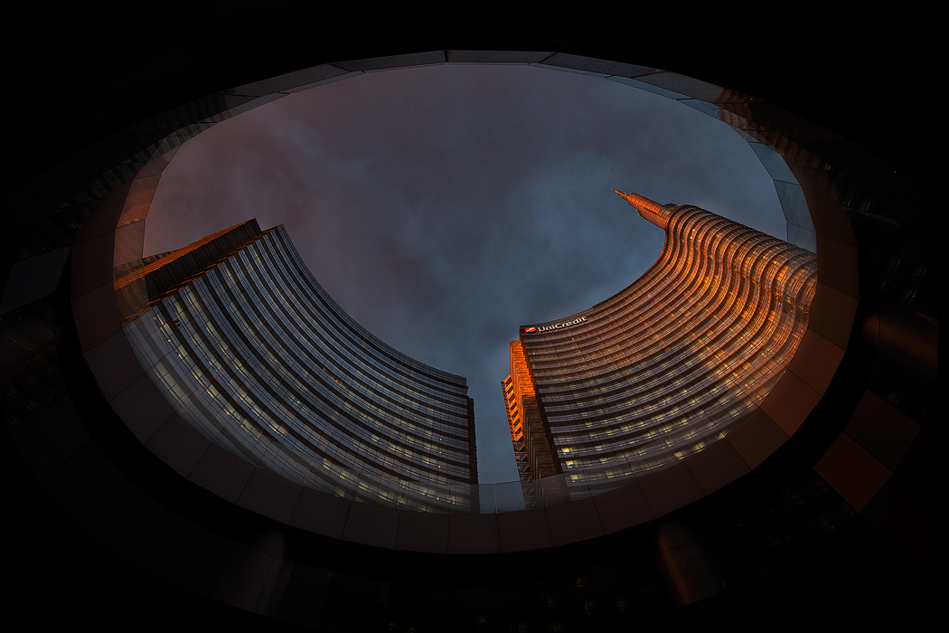 Uscendo dall'ufficio verso le sei del pomeriggio ho notato che il cielo sopra Milano si stava annerendo progressivamente e che ad ovest, nella zona dove tramonta il sole in settembre, il cielo era compeltamente libero. Il sole era ancora coperto dalle nuvole, ma secondo i miei calcoli, in circa un'ora sarebbe uscito dalla coltre nuvolosa con effetti di luci e colori che si potevano supporre interessanti. Non vi era tempo di cercare una location paeaggistica ma solo di andare verso i grattacieli del nuovo skyline di Milano e cercare una qualche inquadratura. Sotto la pioggia, mi avvio verso piazza Gae Aulenti, pensando a cosa potessi fotografare. Mi sono ricordato di una foto dell'amico Rampi (http://www.photo4u.it/viewcomment.php?pic_id=635947) e sono sceso nel posteggio sotto la piazza e lì protetto dalla pioggia ho realizzato questo scatto, proprio quando il sole era oramai vicino all'orizzonte e retrolluminava la città.