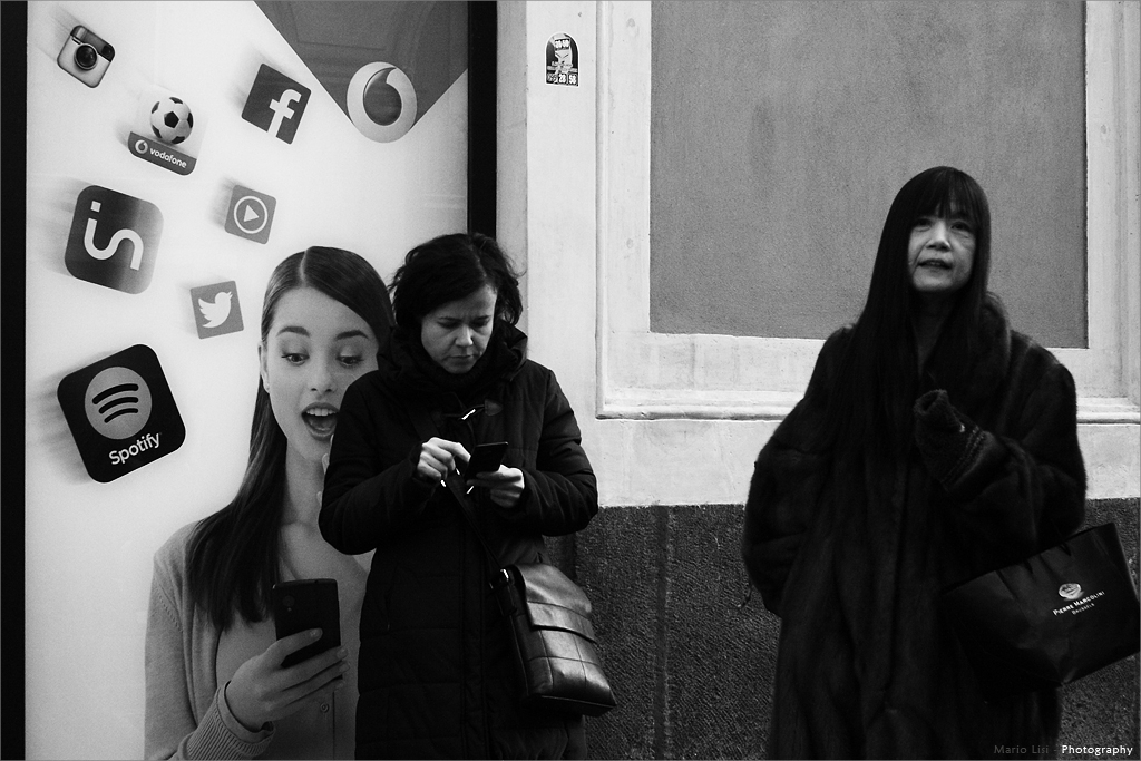 Bello scatto,anche il bn mi piace.Ho solo qualche perplessità per il soggetto di destra(peraltro con una interessante espressione) che in qualche modo distrae dalla situazione tipicamente street generata dal cartellone e dalla donna con telefonino.Bisognerebbe trovare forse il coraggio di un taglio!  _________________ Sergio Demitri https://www.flickr.com/photos/124946035@N02/ |