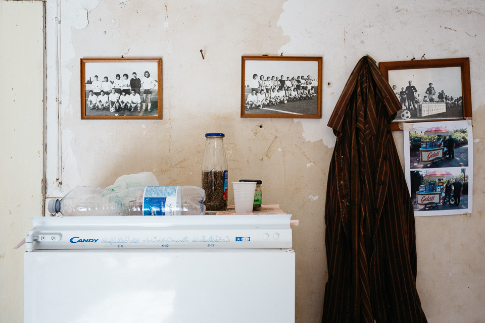 uno scorcio di ricordi incastonati su parete segnata dal tempo e mischiati ad elementi d'utilità quotidiana.