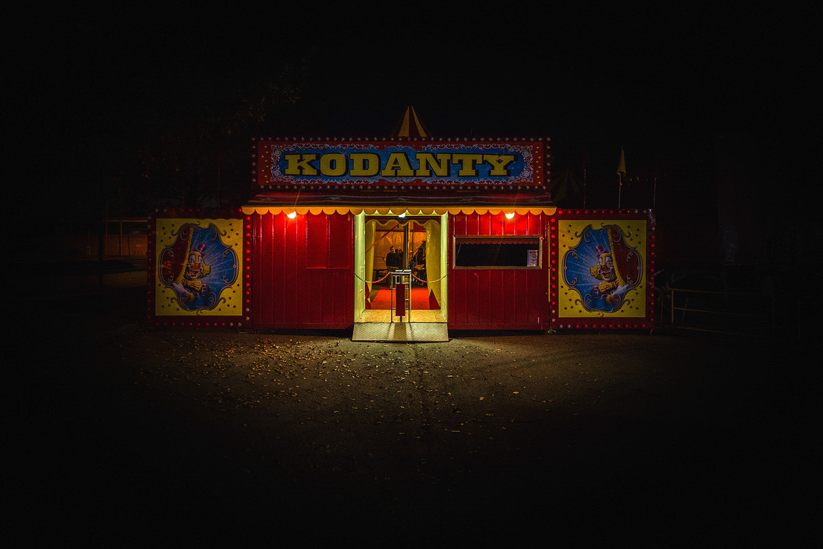Molto belle le tonalità di colore caldo sul soggetto, tinte vivide e dense, eppure la luce lascia solo una bellissima impronta sul selciato sterrato dell'ingresso, che infiamma appena poche foglie cadute, e poi tutt'intorno regna la oscurità, nera ed impenetrabile, come una minaccia sulla allegria del cuore entrale della scena. Il circo, fin da da piccolina, mi ha sempre ispirato una strana malinconia, un non so che di misterioso e malinconico insieme , unito ad una idea di migrazioni, di precarietà, di allegria solo mimata. Questa immagine mi restituisce in pieno una idea emotiva che trova qui prefetta visibilità. E quindi la trovo più che riuscita, con quel doppio sorriso, beffardo, di clown.
