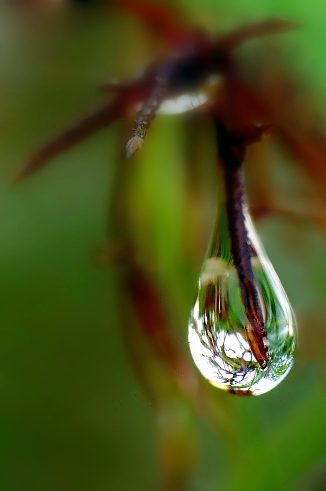 Lo sfondo mi sembra molto piacevole con i vari toni del verde e lo sfuocato ben vellutato per cui ottimo. Quello che non mi convince sono secondo me è il riflesso troppo forte della goccia che è appunto la protagonista di questa foto è la mancanza di un immagine ben definita all interno.