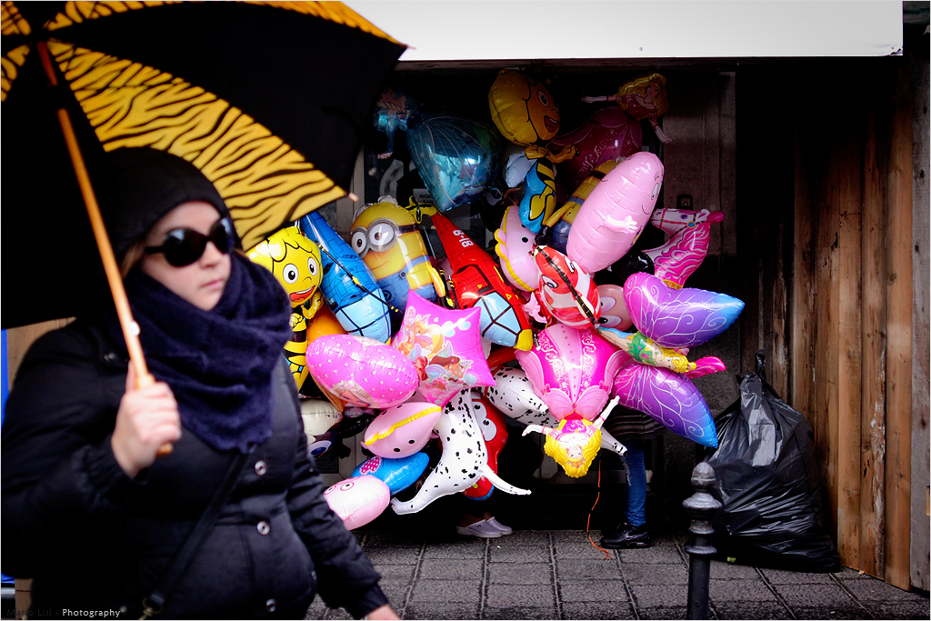 Ipoteticamente, leggendo da sinistra verso destra, la lettura dovrebbe essere sospinta verso la coppia di piedi nascosti sotto il caos di palloncini: a mio personale avviso il motore della composizione.