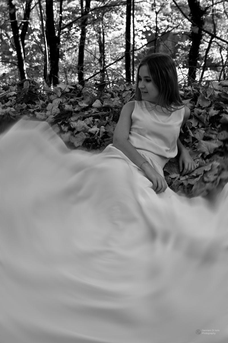 Molto bello questo ritratto BW, mi piace la posa della modella e il mosso radiale del vestito..
