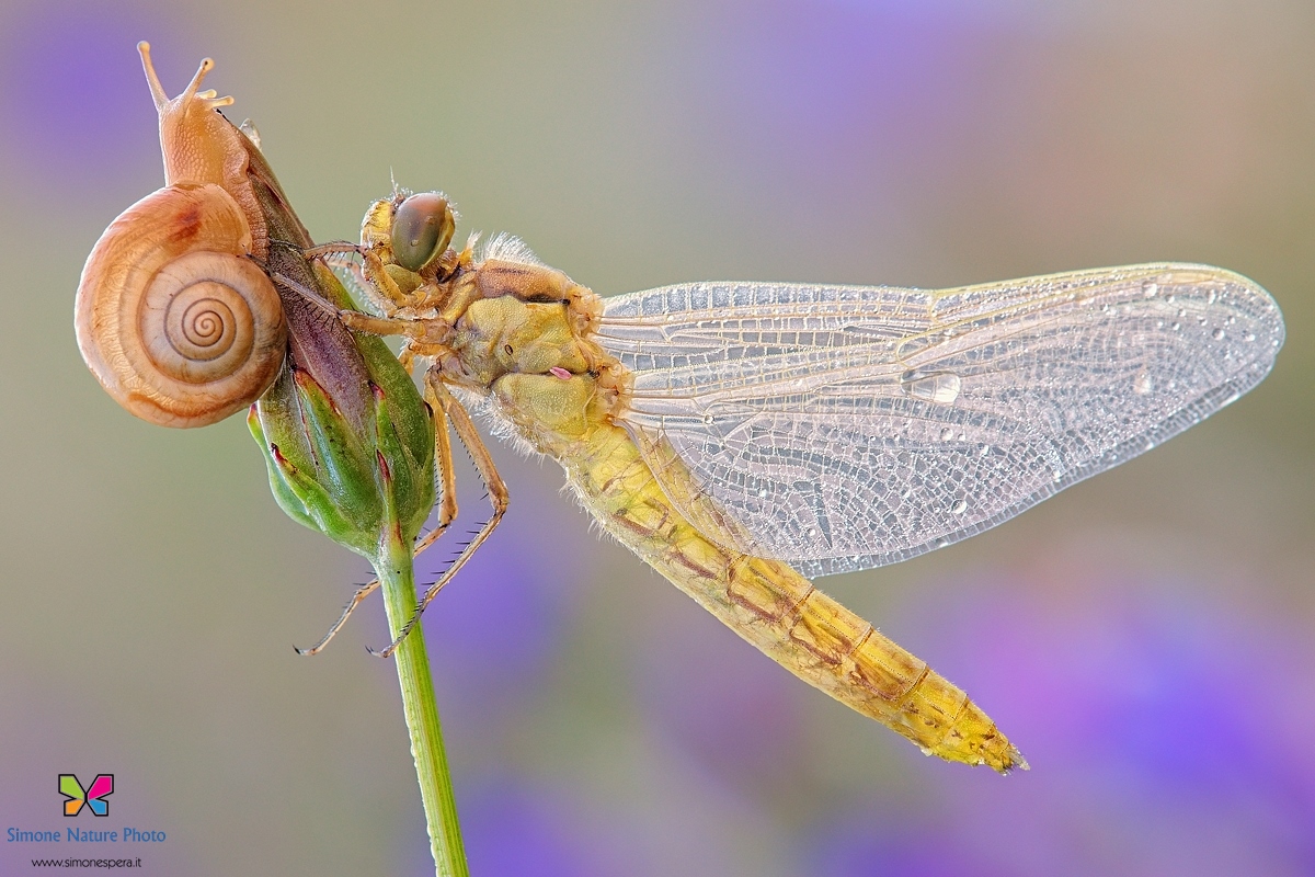 I colori che trasudano dai tuoi scatti sono una tua firma..., una meraviglia. Ottimo dettaglio sulla chiocciolina ed anche su gran parte della libellula, tranne le ali: conoscendo le tue grandi doti mi viene da pensare che hai avuto i tuoi buoni motivi per restare a f10..., per esempio la chiocciolina non stà mai ferma... Bravo Simone.