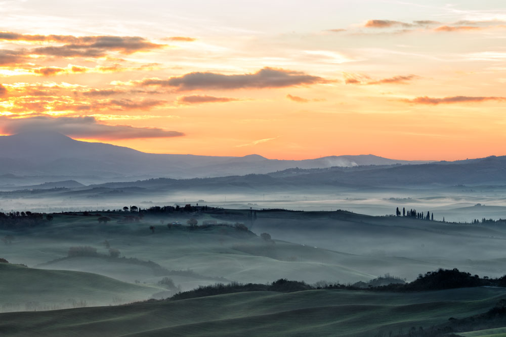 sempre belle queste vedute collinari ... qui arricchite dalla morbida plasticità della foschia, resa quasi tangibile dalla luce e dall'adeguata post-produzione ...