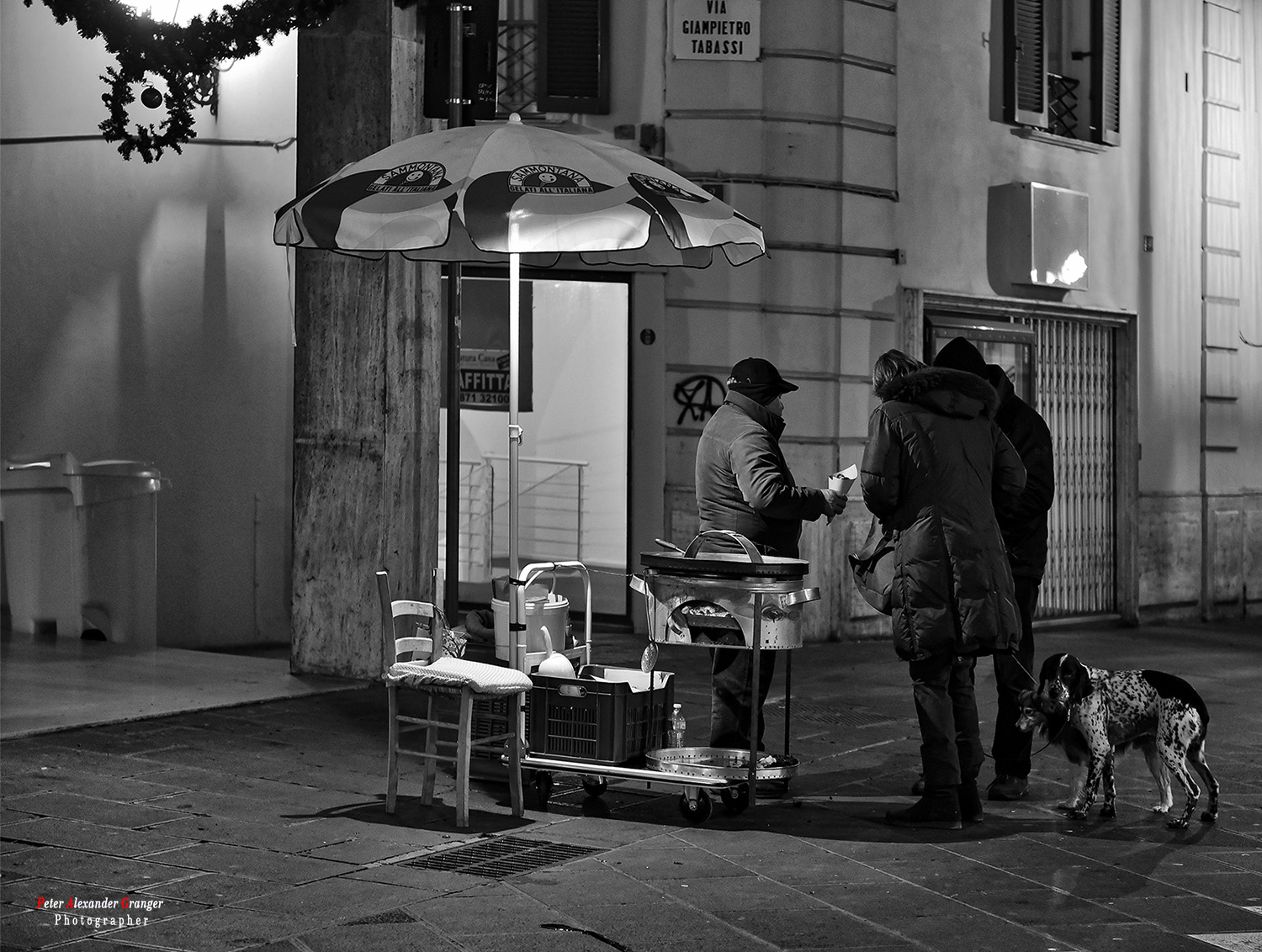 il b/n è buono, come street la trovo deboluccia, è una scena di ordinaria quotidianità. tutti i soggetti, tranne il cane, sono di spalle e non si percepisce il gioco di sguardi che dovrebbe caratterizzare una street. Wink