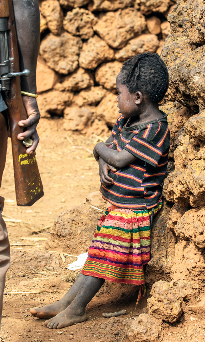 Io credo, ma potrei tranquillamente sbagliarmi, che l'autore volesse inserire volutamente l'elemento di sinistra, visto anche il titolo. Se così fosse, lo spazio concesso all'uomo ed al fucile è troppo poco all'interno del fotogramma. È debole anche, a parer mio, la relazione tra il bambino ed il fucile...