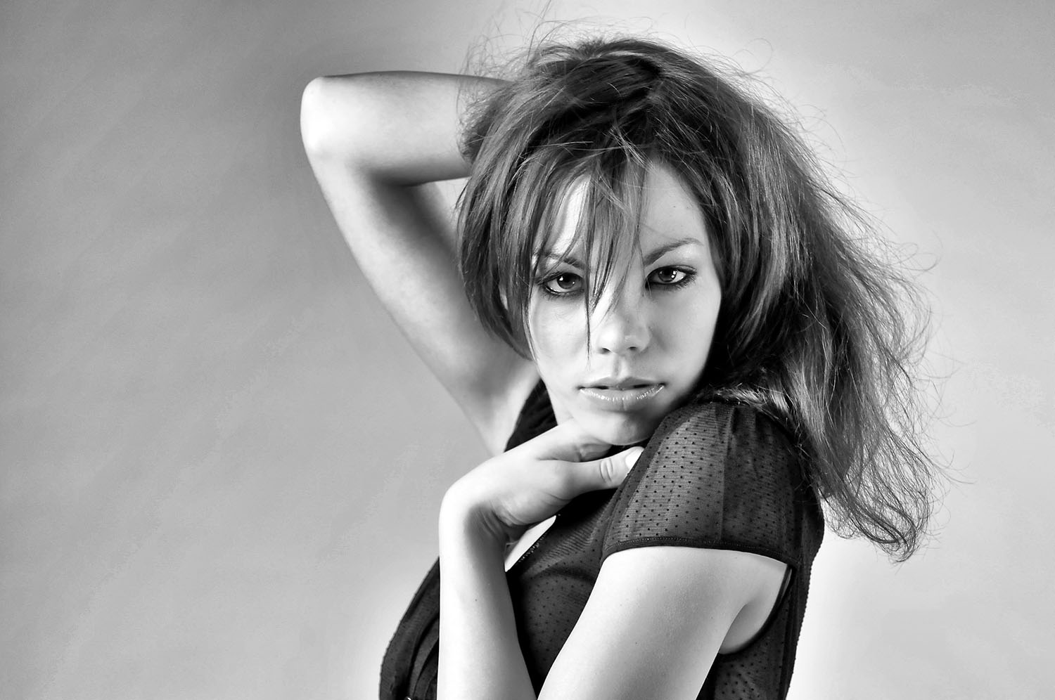 | Lo sguardo di questa ormai famosissima modella è eccezionale. Le luci sono un po esuberanti sul volto ed andrebbero atuttite. La prima mano la trovo funzionale , l'altra per "me" è superflua ed anzi la resa mi disturba anche un poco. |