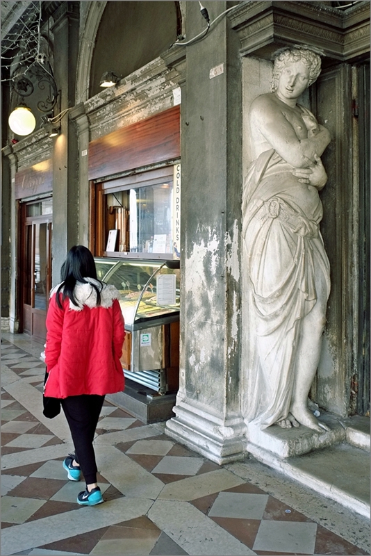Interessante compresenza di figura e umana e statua! L'una ignara di tutto, voltata di spalle, l'altra che sembra quasi dialogare con lo spettatore.