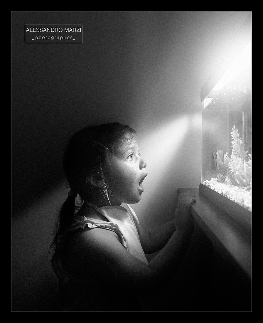 | la parte più chiara alle spalle della bimba.. in realtà è la luce del neon che arriva meno forte rispetto alla parte davanti la faccia perché il punto è più lontano. quelle nella parte superiore sono giochi di luce sempre dovute al vetro del neon e movimento dell'acqua. in più l'ottica che ho usato l'avevo in prova ed aveva le muffe sulla lente. comunque in post io ho accentuato i contrasti tra luci e ombre. contrasti non aggiunti |