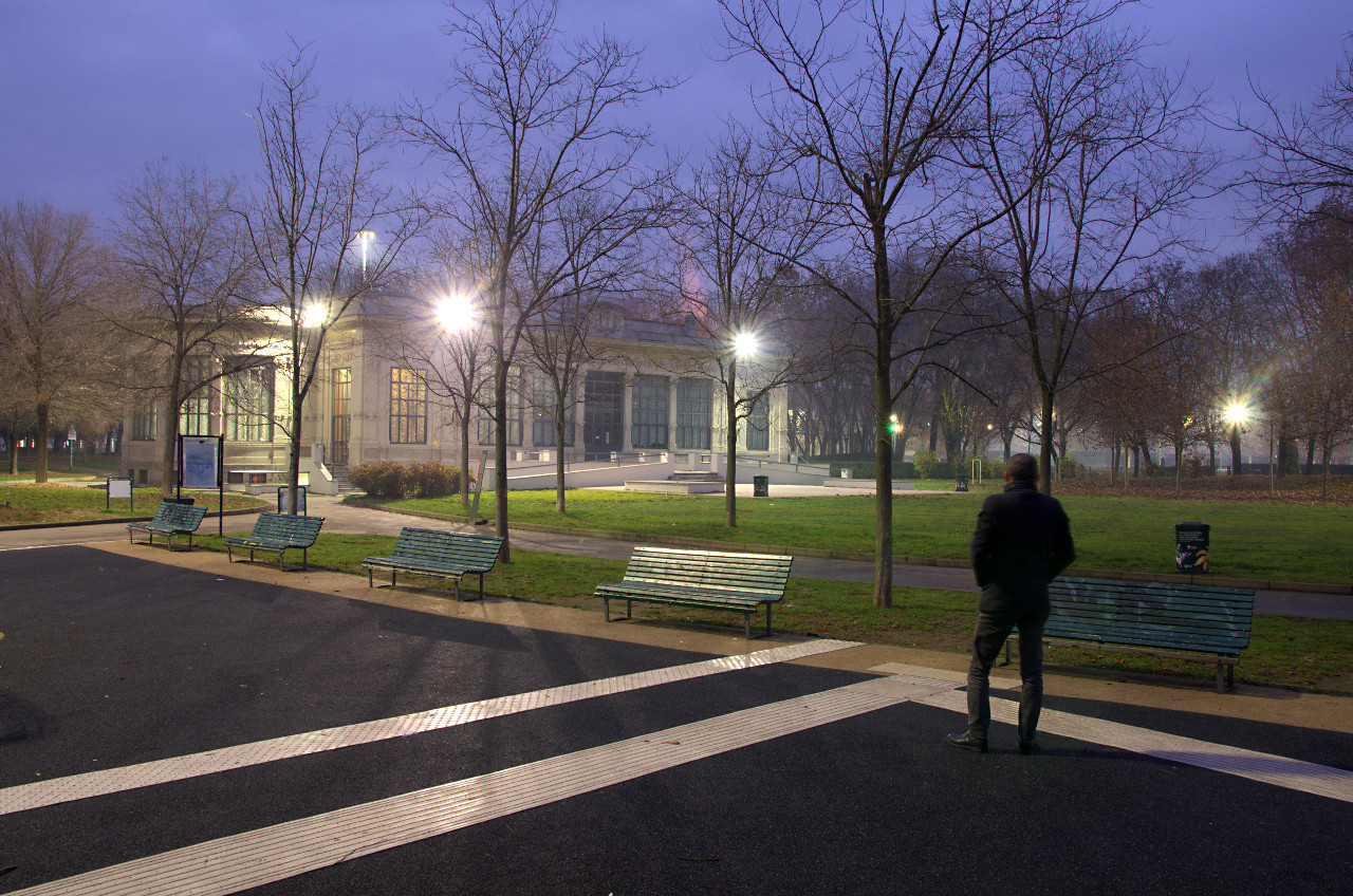 Pare che il soggetto si sia fermato notando la panchina riflessa di luce...un segno? Chissà! Complimenti Daniele..