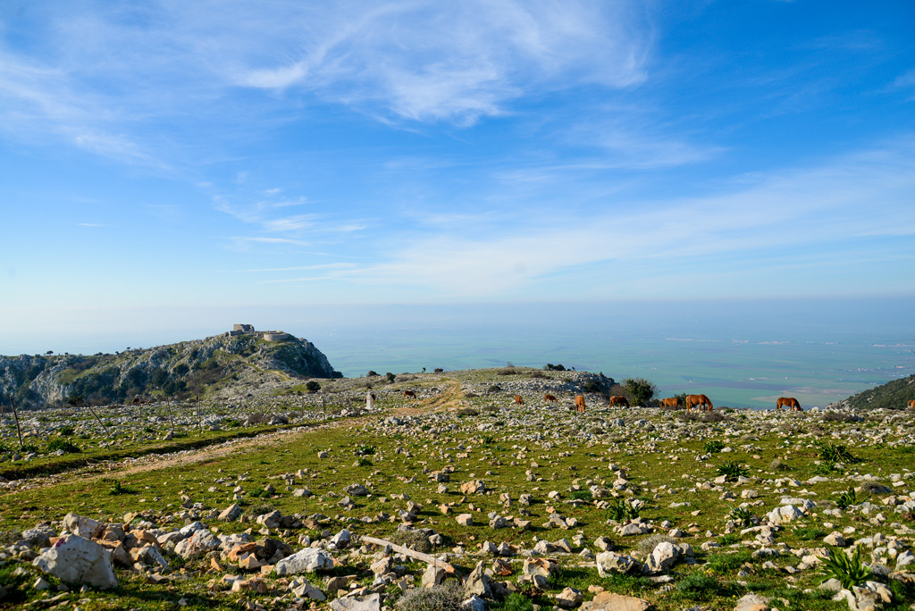 Uno scorcio in luce piena e al limitare, a quanto vedo, di una discesa del pendio collinoso oltre il quale, nella foschia, si intravvedere una estensione pianeggiante e , al limitare lontano il mare. Le tinte, nonostante la luce dura del giorno pieno, sono molto naturali e la sensazione che io ricevo è di ariosità ed ampiezza. Come note criticabili però io noterei subito una linea d'orizzonte da rettificare un poco per la lieve pendenza visibile , mentre per la base di fitti sassi in primo piano, forse sacrificherei una piccola parte, per avere una sensazione conseguente poi di orizzonte meno centrale, e anche un pur illusorio avvicinamento dello sguardo ai cavalli al pascolo, che risultano visibili ma minuscoli.