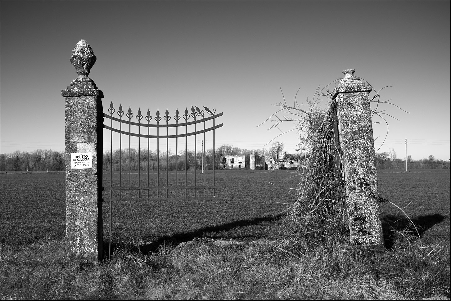 Molto suggestivo questo antico ingresso nella proprietà,con brandelli di cancello,buono ora solo a sorreggere il cartello con divieto di caccia.Bello il bn e grande la profondità.Complimenti!  _________________ Sergio Demitri https://www.flickr.com/photos/124946035@N02/ |