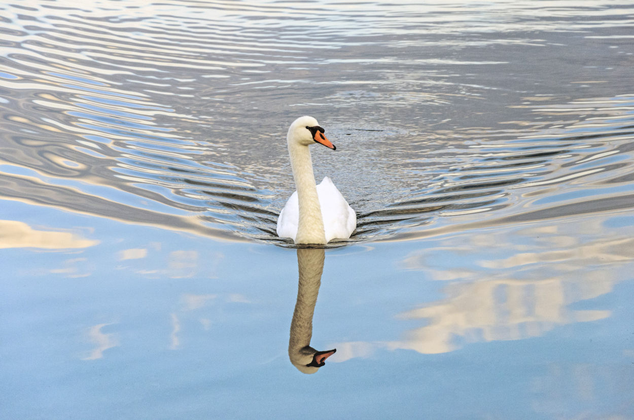 il soggetto è centrale, ma in questo caso non penalizza la composizione in quanto bilanciata ottimamente dalla scia d'acqua lasciata dietro di se e valorizzato dal bellissimo riflesso che include anche le nuvole