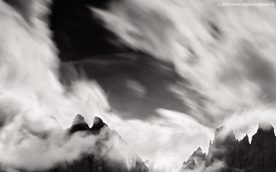 Giganteggiano le nuvole, le vere protagoniste di questo scatto, avvolgendo il cielo e le montagne.