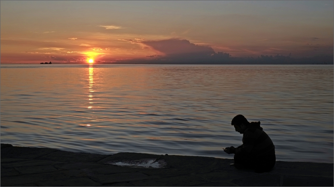 A me piace, quel tramonto così acceso, il mare, l'imbrunire coi bei colori crepuscolari, e un uomo che dopo magari una giornata di lavoro lontano da casa manda un pensiero ai propri cari.. "torno presto, mi mancate". Forse un po' forzata la mia lettura ma mi piace pensarla così Smile