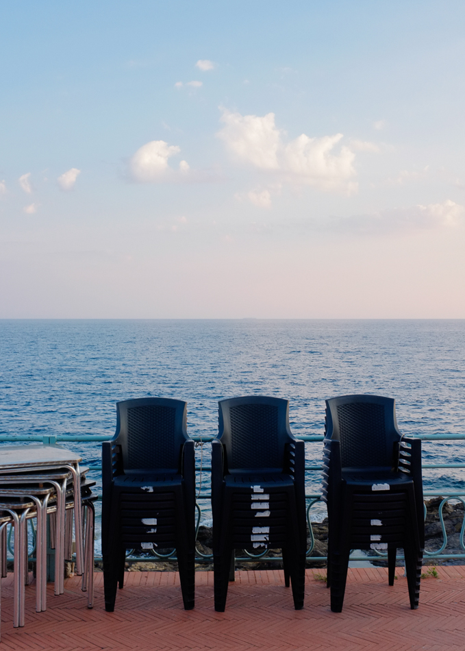 Primi segnali della stagione estiva.Tavolini e sedie,anche se accatastati,cominciano a comparire sui terrazzi a mare.Bella composizione ed ottimi colori. Ok! Ciao