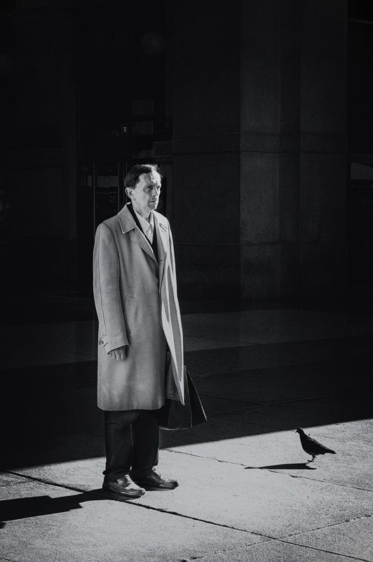Bellissima luce ed ottimo bn.Sembra che anche il colombo sia incuriosito dalla staticità dell'uomo.Mi piace molto! Ciao