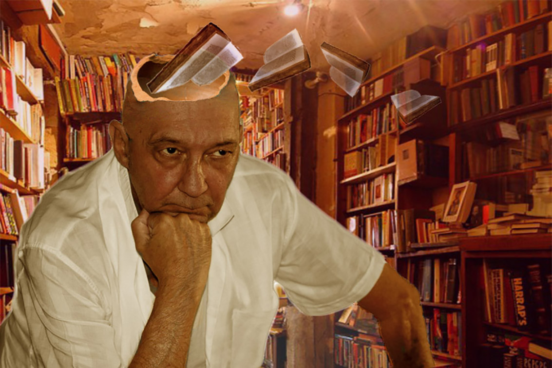 La dimensione, la messa a fuoco e l'illuminazione dei libri aggiunti è mal riuscita. Il libro più vicino è sfuocato tanto da non vedere le lettere sulle pagine, mentre il volto dell'uomo è ben a fuoco.