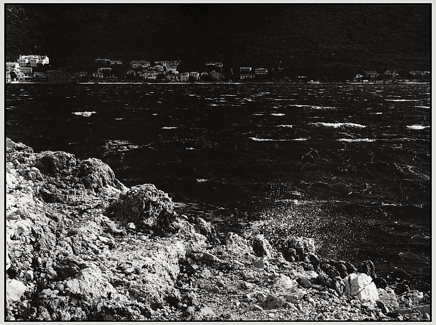 Si, son tutti scatti analogici, il contrasto, ottenuto in fase di stampa, analogica anch'essa, è mirato da una parte a dare l'impressione di un mare "pseudo minaccioso" e dall'altra ad evidenziare le "spumeggianti creste dell'onde". Un saluto.