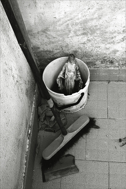 Mi è piaciuto osservare, grazie ai vostri commenti, come la scena, privata del contesto, abbia portato ad una visione " falsata" della realtà: credo infatti che fosse intenzione dei proprietari della statuina di conservarla, quasi proteggerla, nonostante le cattive condizioni nella quale era messa anziché buttarla.