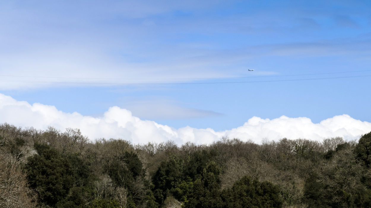 ci sono troppe cose : arbusti, nuvole, fili e aereo.
