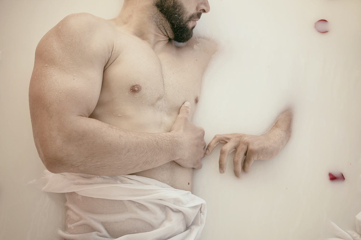 Qui "American beauty" forse è solo un vago accenno: i petali color rubino sono solo un accenno nel bianco. Ma i nostri occhi si soffermano e stupiscono... nel cogliere questa intensa virilità , che emerge però leggera nella liquidità lattea quasi trasparente e lieve del bagno di immersione. Le mane emergono lente dalla superficie, come in un bassorilievo. E il tessuto si avvolge e poi si impregna di bianco ai fianchi. Contrasti che convivono in armonia, che dialogano, con il contributo di un taglio ardito e deciso, che spersonalizza la situazione al massimo, ma sa fermarsi al punto giusto, per non rischiare una restituzione troppo algida e fredda. Una proposta fashion, curata come un signor lavoro da studio, eppure anche emotive.