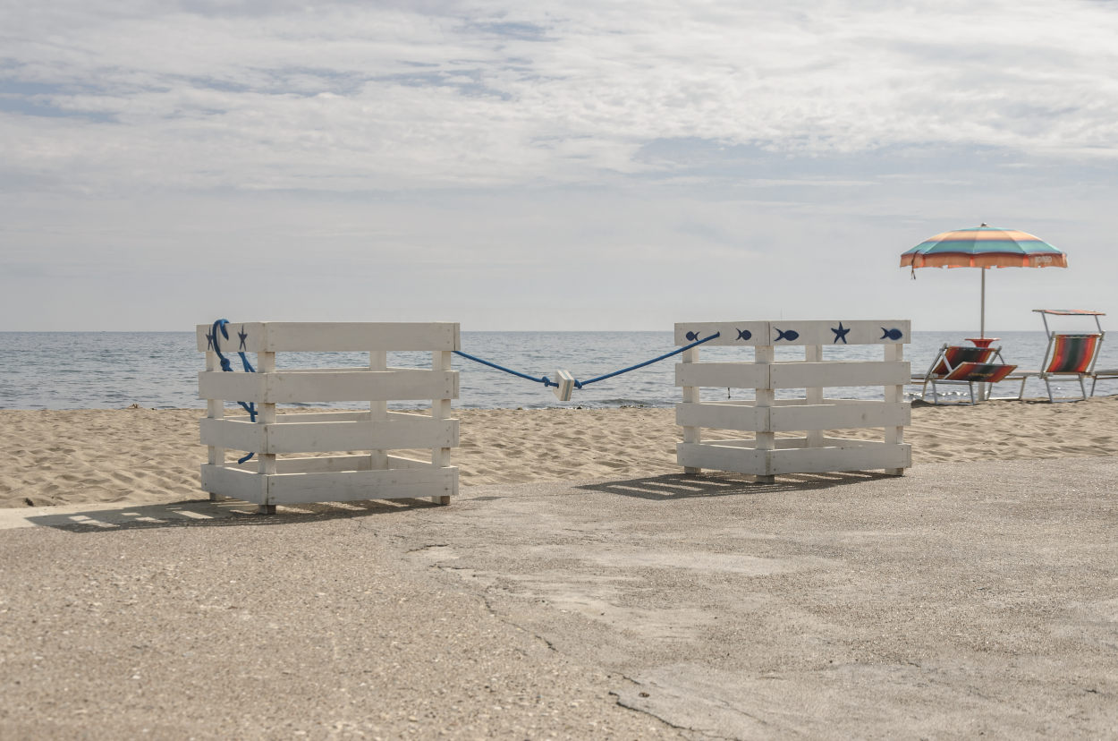 una piacevole immagine riposante, forse un pelino sovraesposta e con i due cubi troppo attaccati al gruppo ombrellone/sdraio