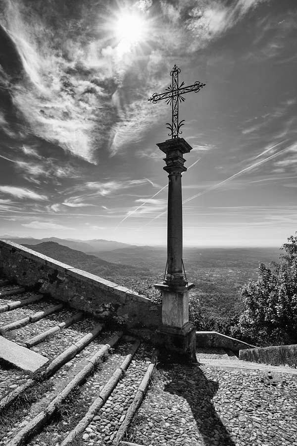 Circa l’ombra della croce portarla nell’angolo del fotogramma mi avrebbe costretto ad una inquadratura del cielo/sole poco efficace. Lasciarla tutta? Si sarebbe stato meglio e me ne sono reso conto una volta scaricata l’immagine. Non attribuisco il fatto ad impedimenti quali i gradini ma piuttosto al fatto che ero talmente preso da gestire l’inquadratura del sole e del cielo con le nubi che proprio per mia mancanza non ci ho badato.