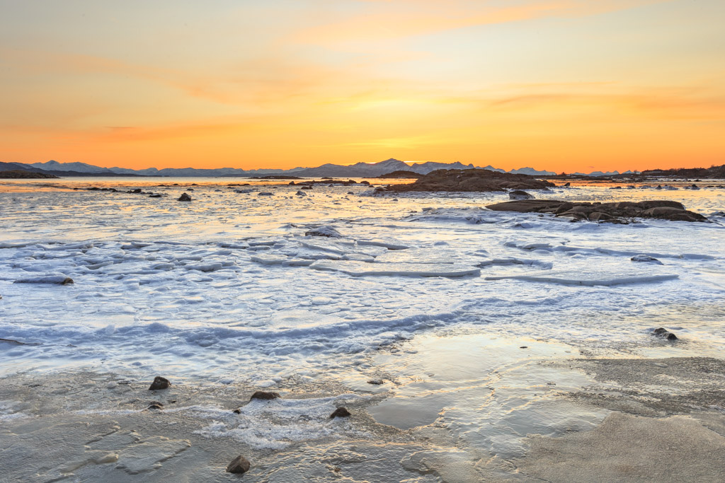 Un bellissimo panorama di questo tramonto infocato che sfuma e lambisce un primo piano freddo e placido Ciao